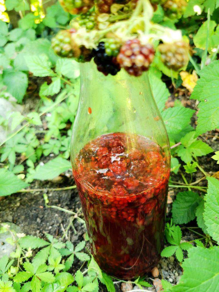 Die Brombeeren zerquetschen und mit Weingeist und Kornschnaps in eine Flasche füllen. 3 Wochen verkorkt kühl und trocken lagern. Danach wird die Flüssigkeit durch ein Leinentuch gefiltert. Den Fruchtrückstand wird mit einem 1/2 l Wasser aufgekocht, nochmals durch ein Tuch abgeseiht. Nun kochst du den Saft mit 3/4 kg Zucker ca. 5 Minuten wallend und gießt die Flüssigkeit zum vorher gewonnenen Alkohol. Diese Mischung wird in dunklen Flaschen gefüllt und dunkelt gelagert.